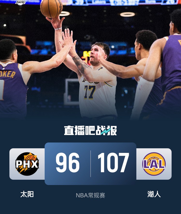 比赛伊始,湖人先声夺人,打出7-0的梦幻开局,但太阳迅速以9-1的攻势还以颜色。随后东契奇外线火力全开,连续命中三分,帮助湖人建立领先优势。文森特的三分命中一度将分差拉开至20分。次节双方陷入拉锯战,太阳三巨头状态低迷,外线颗粒无收,而里夫斯则接连命中中远投,海斯继续在内线"吃饼",半场结束时湖人仍保持17分的领先优势。易边再战,比尔因腿筋伤势提前退场,杜兰特连续命中中远投,砍下8分,一度将分差迫近至个位数。但东契奇先是送出精妙助攻止血,随后又连续杀伤内线,帮助湖人稳住阵脚,三节战罢湖人仍领先12分。末节双方命中率均有所下降,里夫斯命中关键3+1,东契奇随后又打成2+1,帮助湖人牢牢守住双位数领先优势。最终湖人以107-96力克太阳,终结4连败。