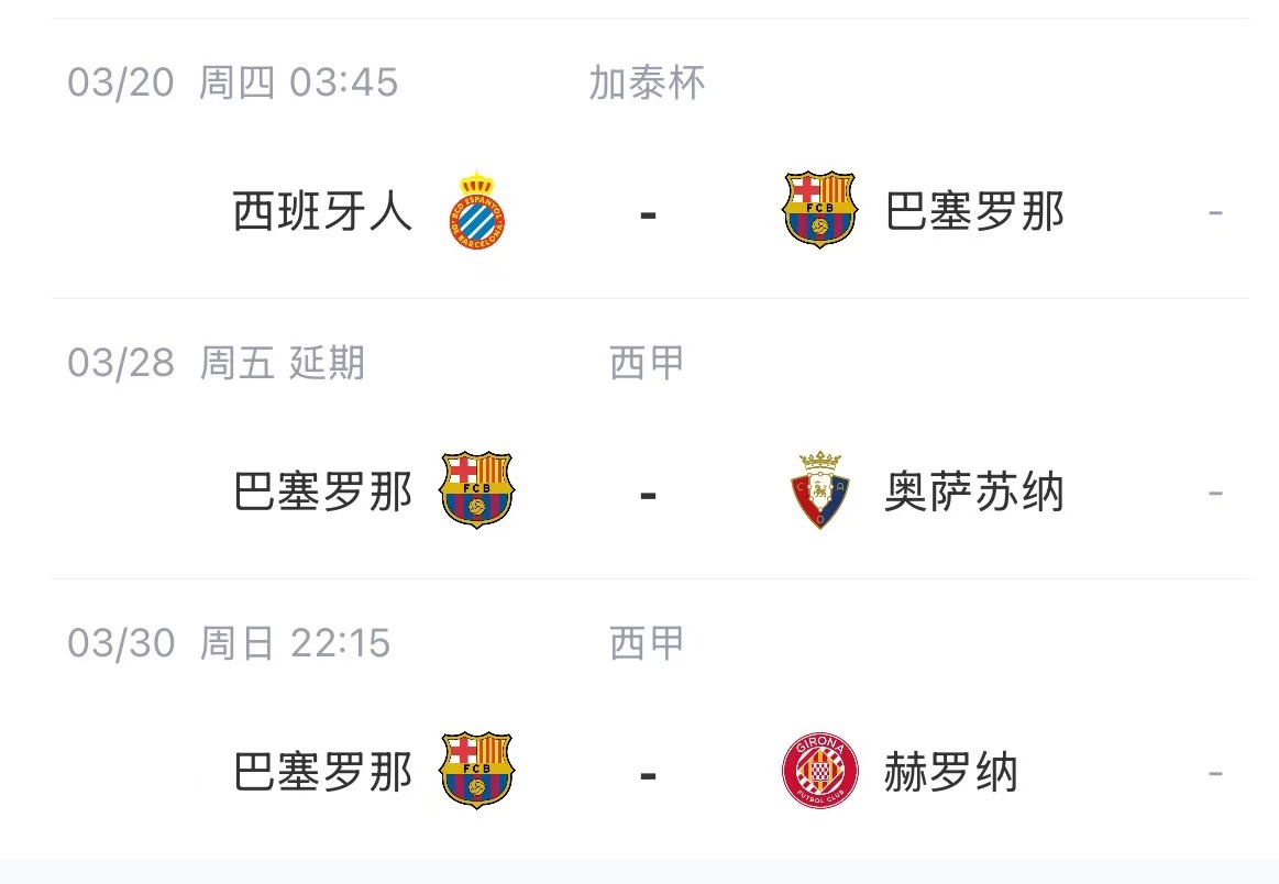 目前,巴塞罗那与奥萨苏纳的补赛具体开球时间尚未最终确定,但已锁定于西班牙当地时间3月27日进行。这一安排或将使巴萨在本月底面临"魔鬼赛程"——三天内进行两场高强度比赛。